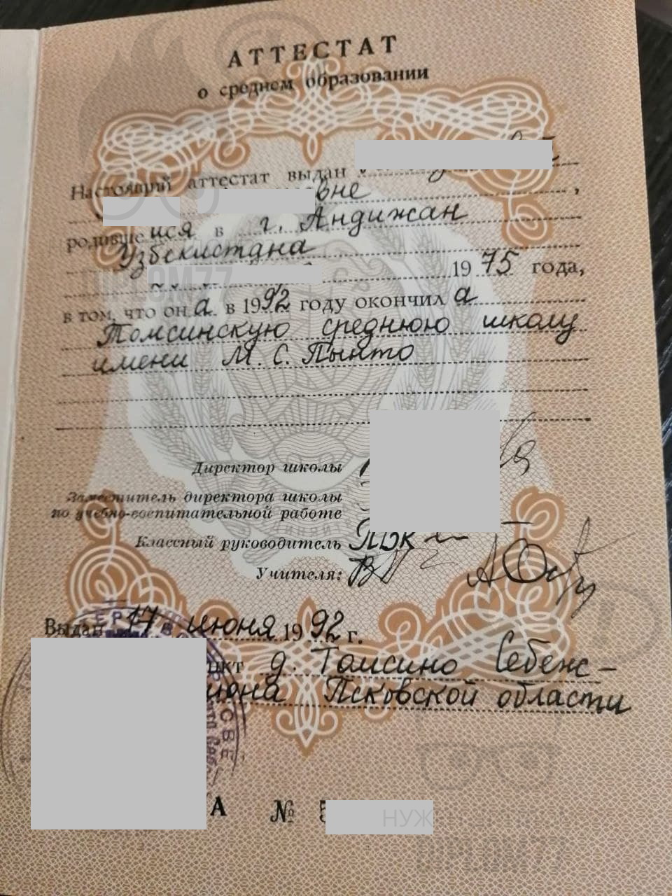 Ответ: Здравствуйте. Аттестат Узбекской ССР не сможем сделать. Только РСФСР есть бланки. Аттестат о средней (полном) общем образовании 1990 года выдачи будет стоить 25 000 рублей. Делается за 3-4 дня и плюс время доставки. Заказать документ можно (текущая страница). Подробнее о вариантах оплаты и доставки здесь: https://diplom77e.cfd/dostavka