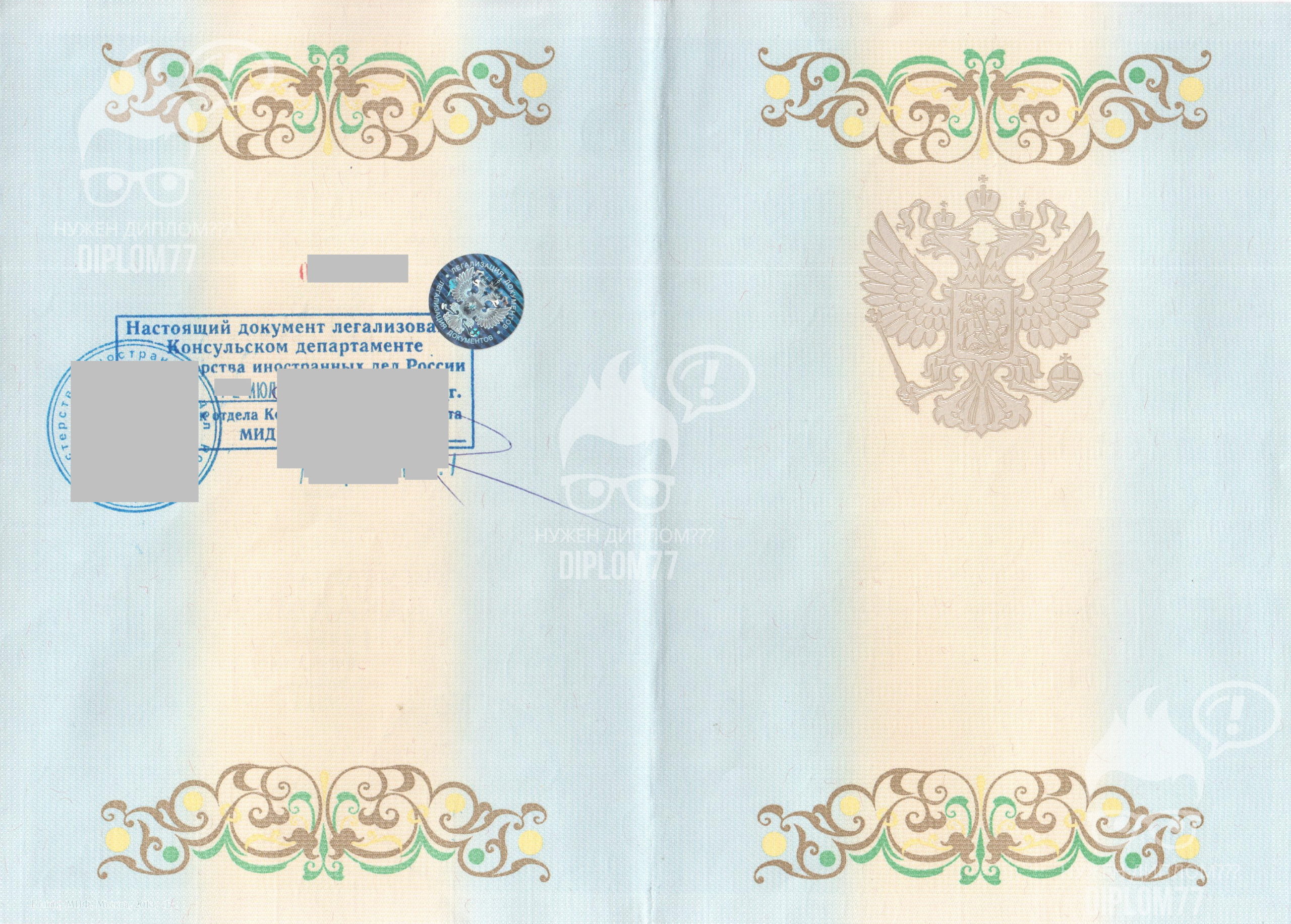 Посмотрите как выглядел диплом в те годы. Бланк показываю который шел с 2011 года, но диплом был выдан в 2013 году, когда уже новые бланки появились с большими приложениями. Диплом был легализован в МИД РФ — можете не обращать на это внимание. Это требование к дипломам выезжающим за пределы Российской Федерации для использования за рубежом. Интересен именно сам бланк и его заполнение.