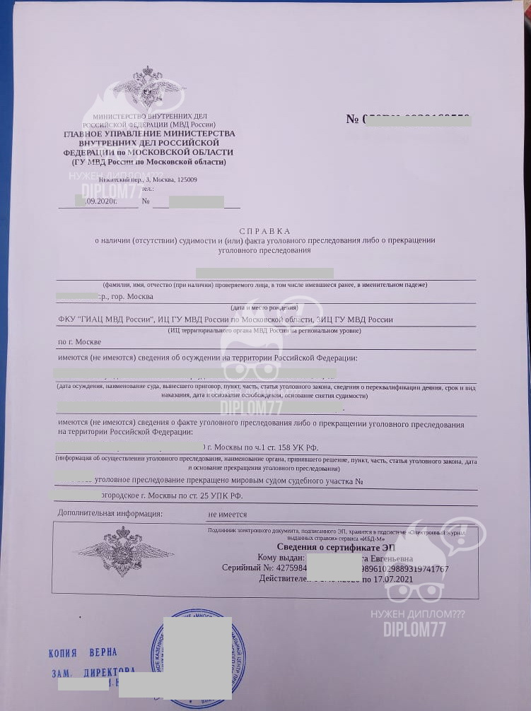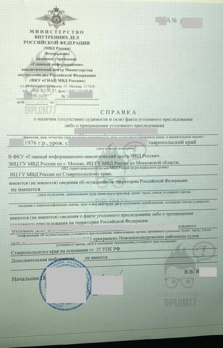 Справка об отсутствии судимости сегодня требуется в большом количестве жизненных ситуаций. Но что делать, если судимость была? Пусть она уже погашена, но зачем это показывать другим людям? Наилучшим решением будет купить справки о несудимости. И Диплом77 поможет вам это сделать максимально быстро и качественно. Мы много лет занимаемся изготовлением этих справок ещё с тех далёких времён когда их делали даже в ИЦ МВД на обычной белой бумаге. Поэтому мы можем сделать справку о несудимости с любого региона РФ (есть абсолютно все образцы).